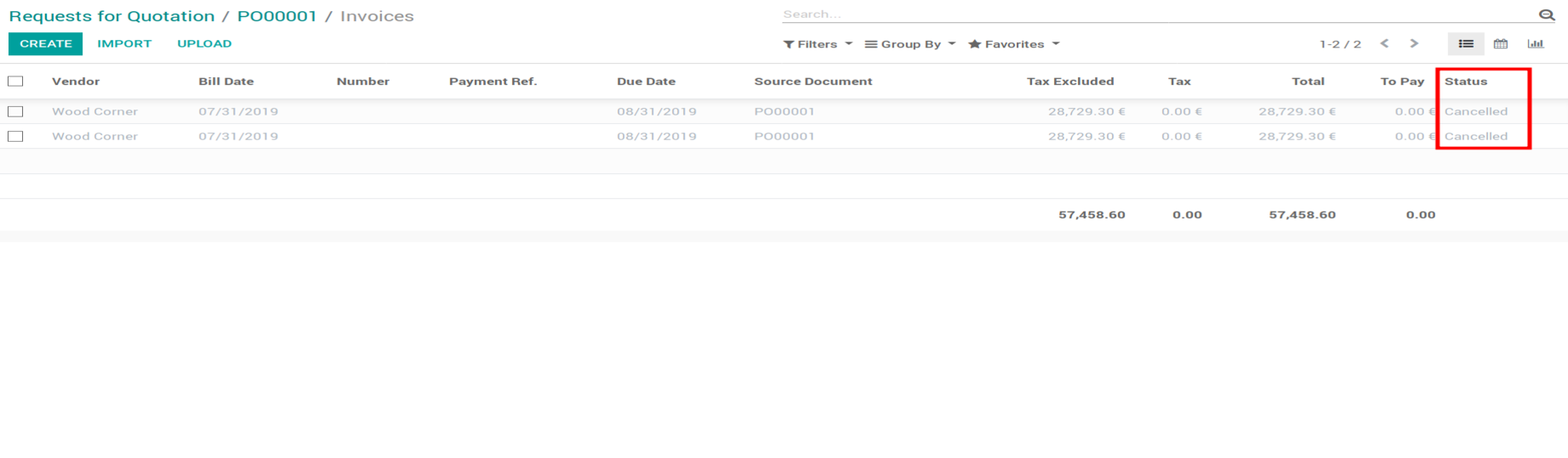 Following image shows purchase order after clicking on cancel button, After cancelling purchase order,You can see the order is in 'Cancelled' state and reset to draft button will be appear.