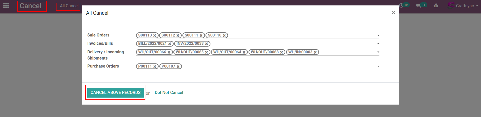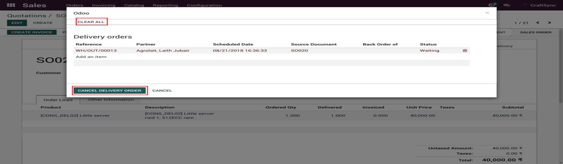After Click Cancel Delivery, if order has one delivery than system will direct cancel that delivery, if more than one delivery than user can select which delivery order want to cancel. By click on clear all button all delivery will remove from wizard.