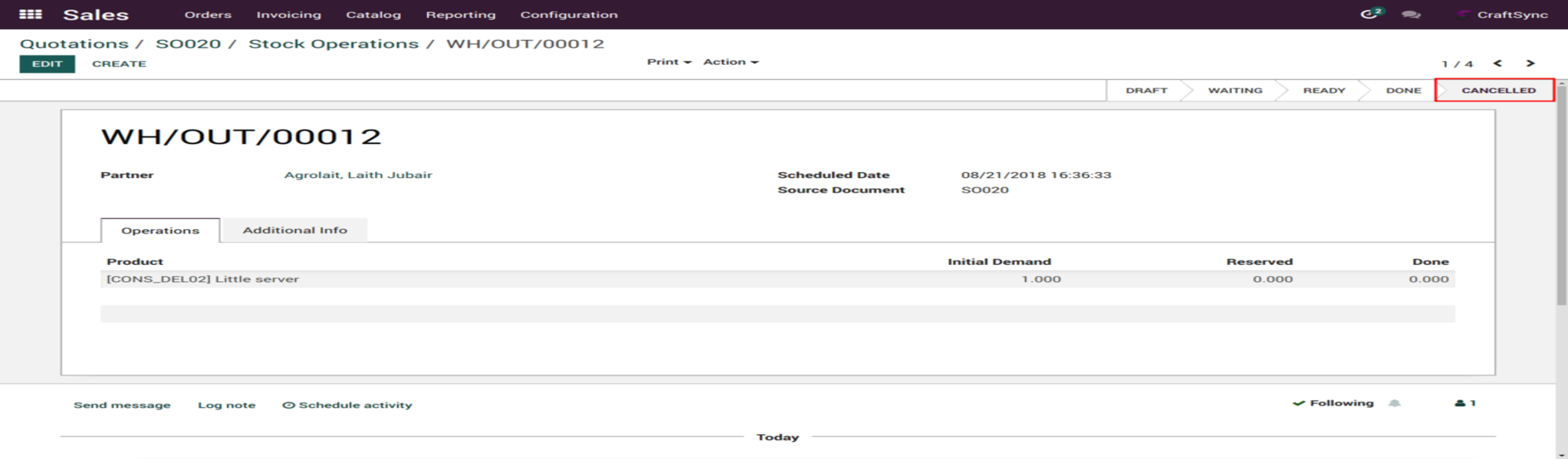 After cancelling delivery order, You can see the delivey is in 'Cancelled' state and user can delete that delivery.
