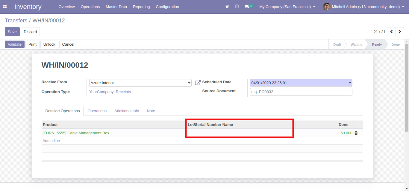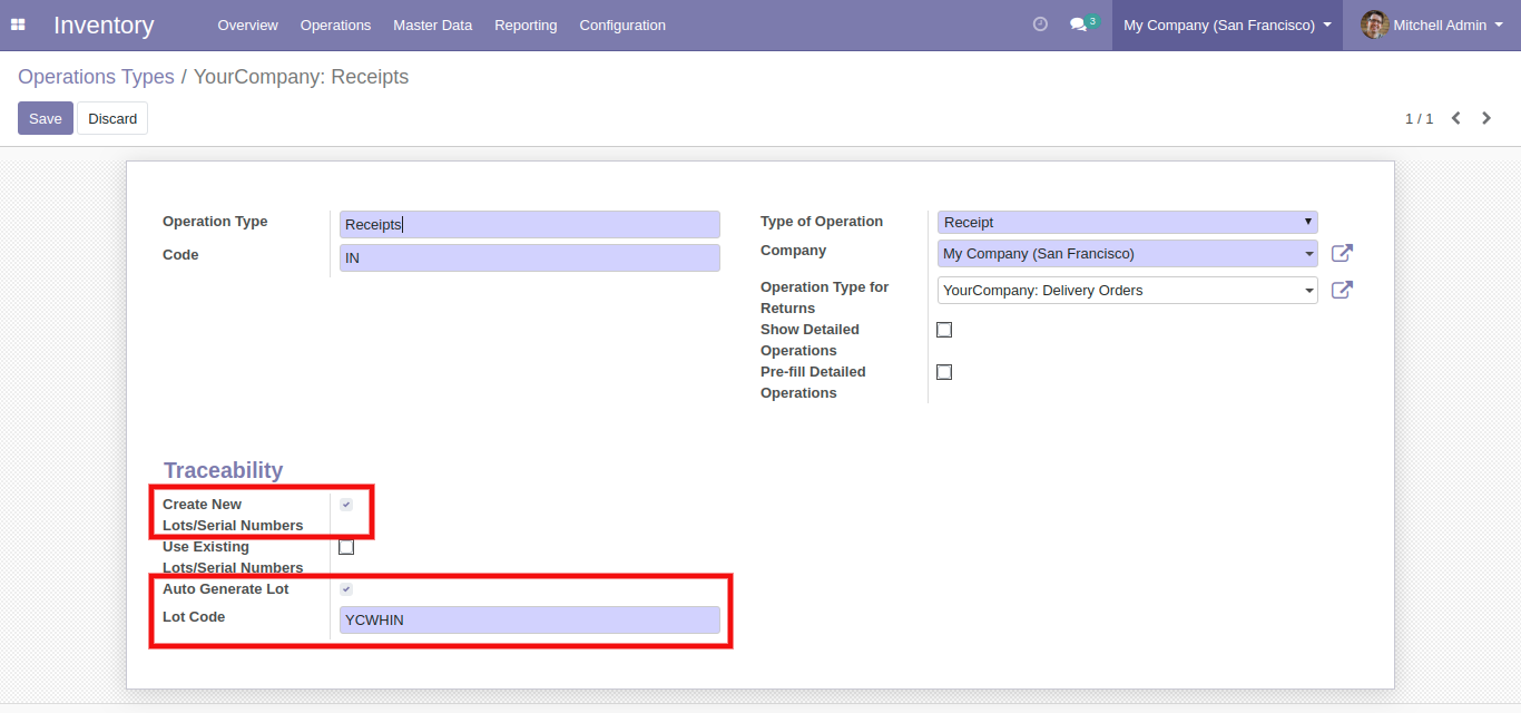 - Lot Number is automatically generated based on Lot code provided in Operation Type configuration.