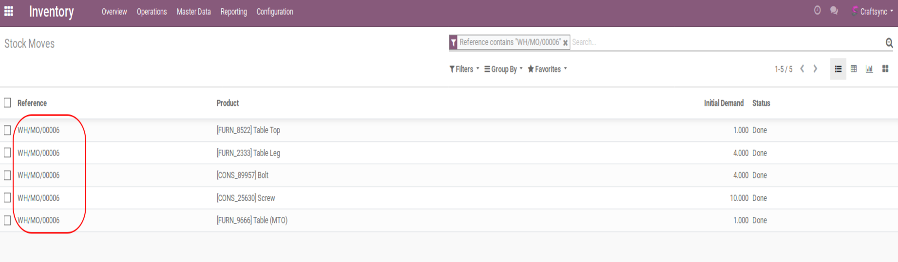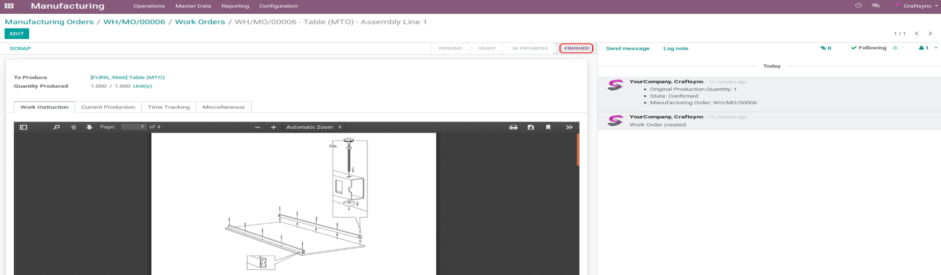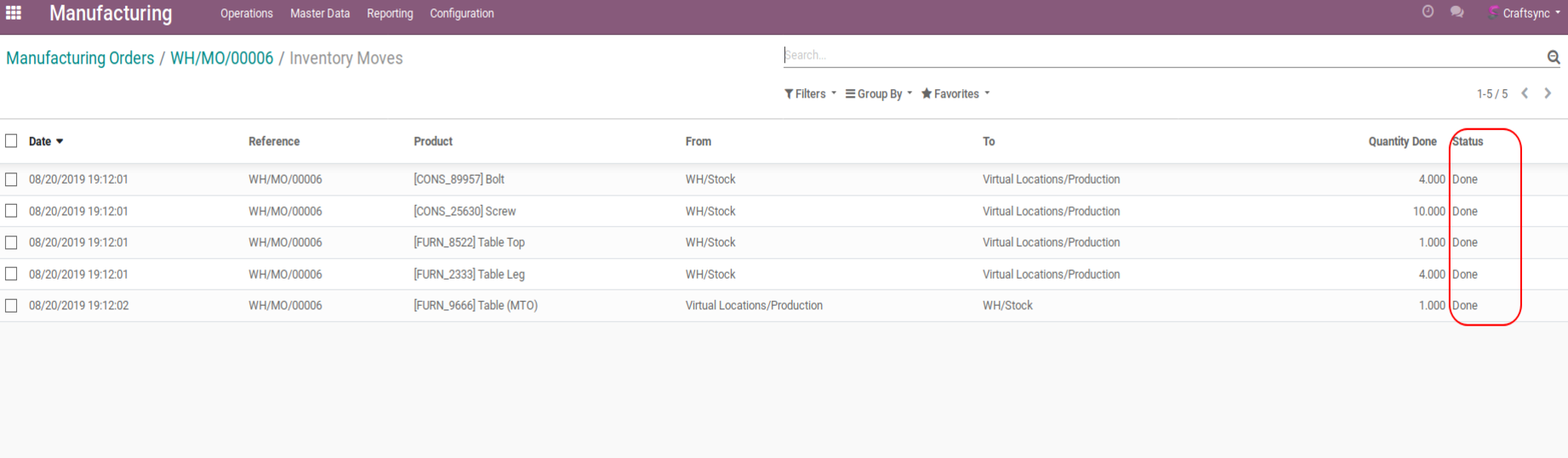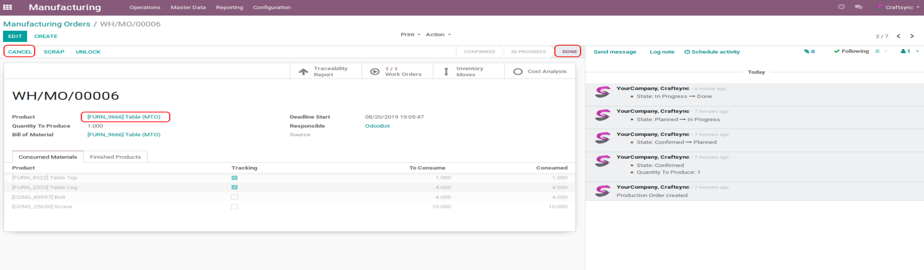 Manufacturing order with work order and inventory move and mo is on Done state.