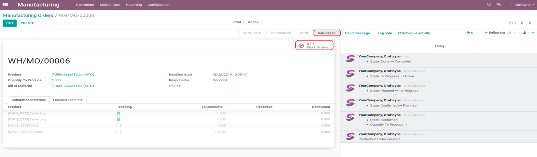 Following image shows manufacturing order after clicking on cancel button, After cancelling manufacturing order,You can see the order is in 'Cancelled' state.