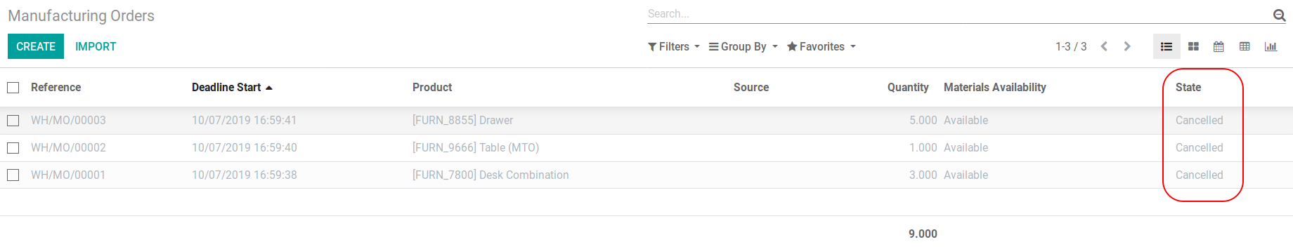 Following image shows in list view of Manufacturing User can select more than one order for cancellation: