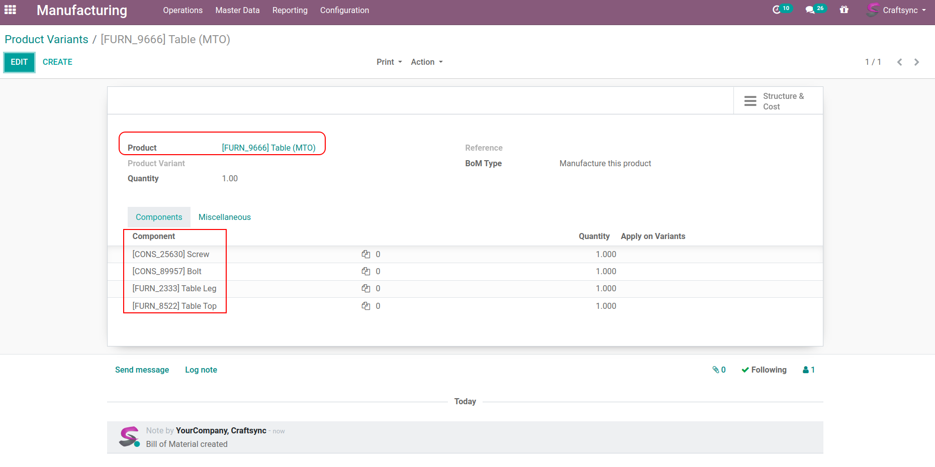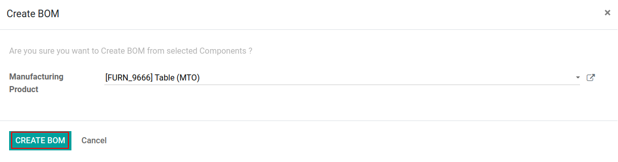 When user click on create bom action below popup will display. User can select manufacturing product of the bom.