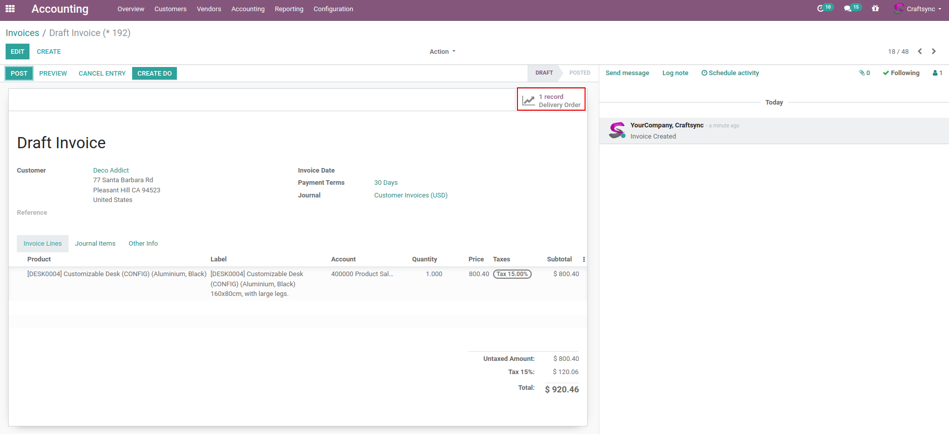 After click on Create DO button detail view of invoice will be shown below. Delivery order smart button for recently created will is automatically set.