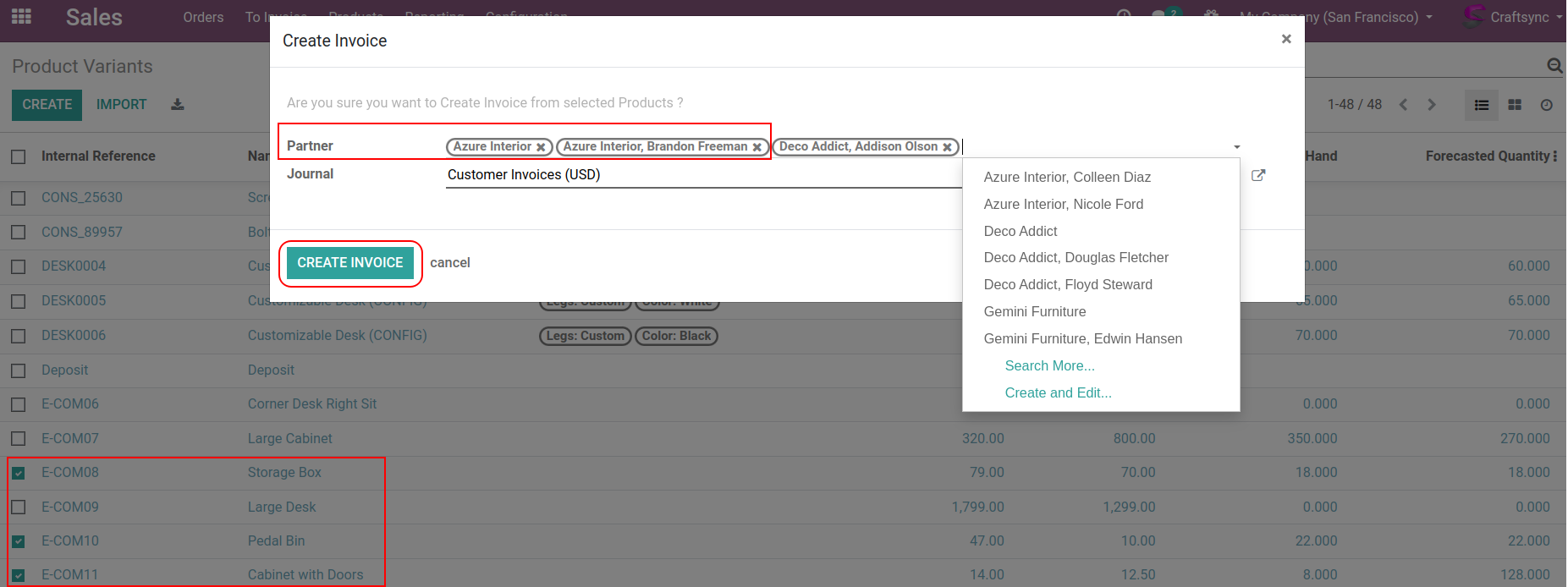 When user click on create invoice or bill action below popup will display. User can select multiple partner for invoice.