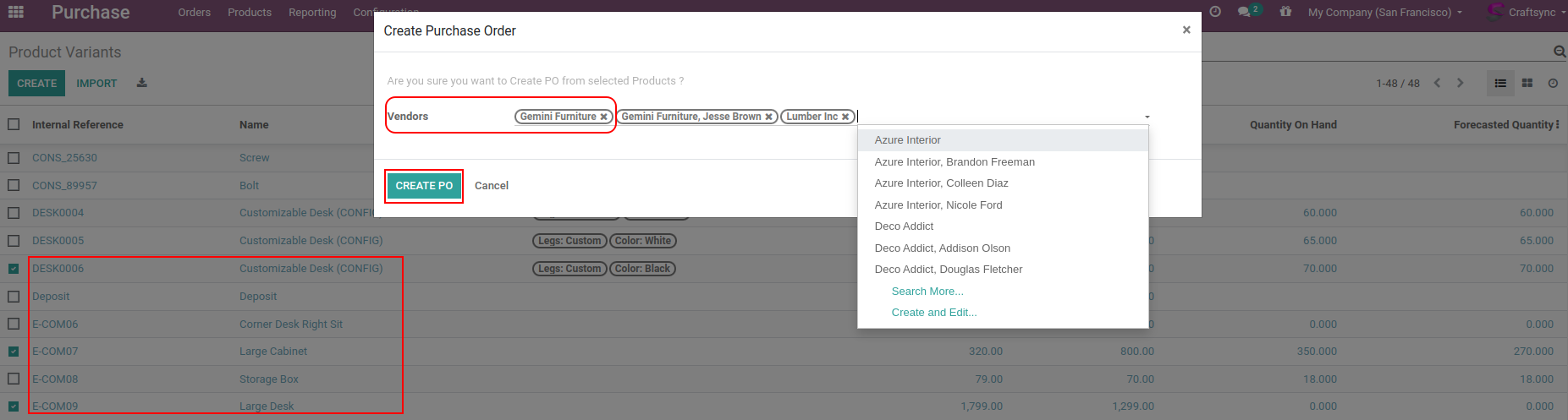 When user click on create purchase order action below popup will display. User can select multiple partner for invoice.