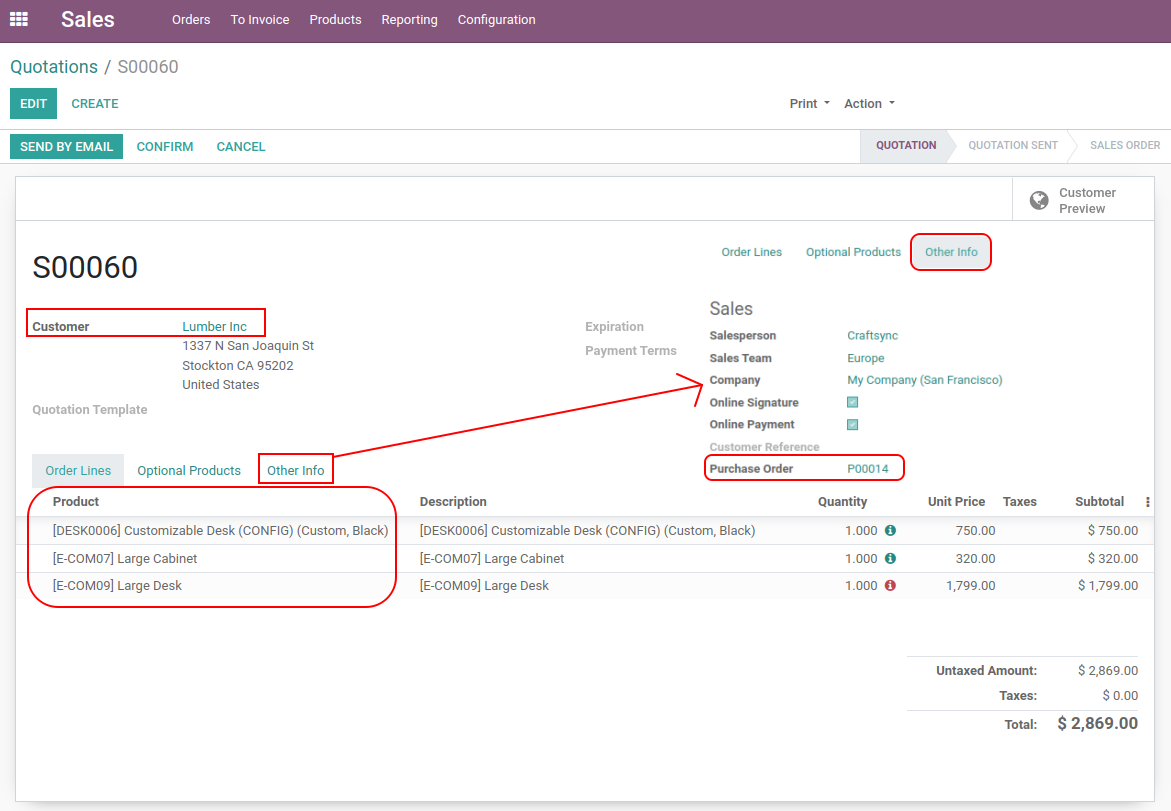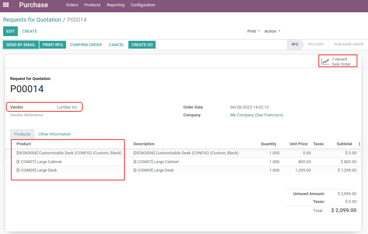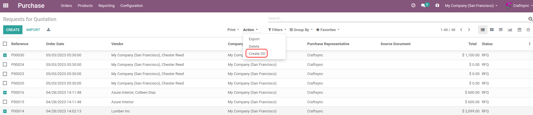 Purchase order reference is set in Sale Order. And po is having smart button for related sale order record.