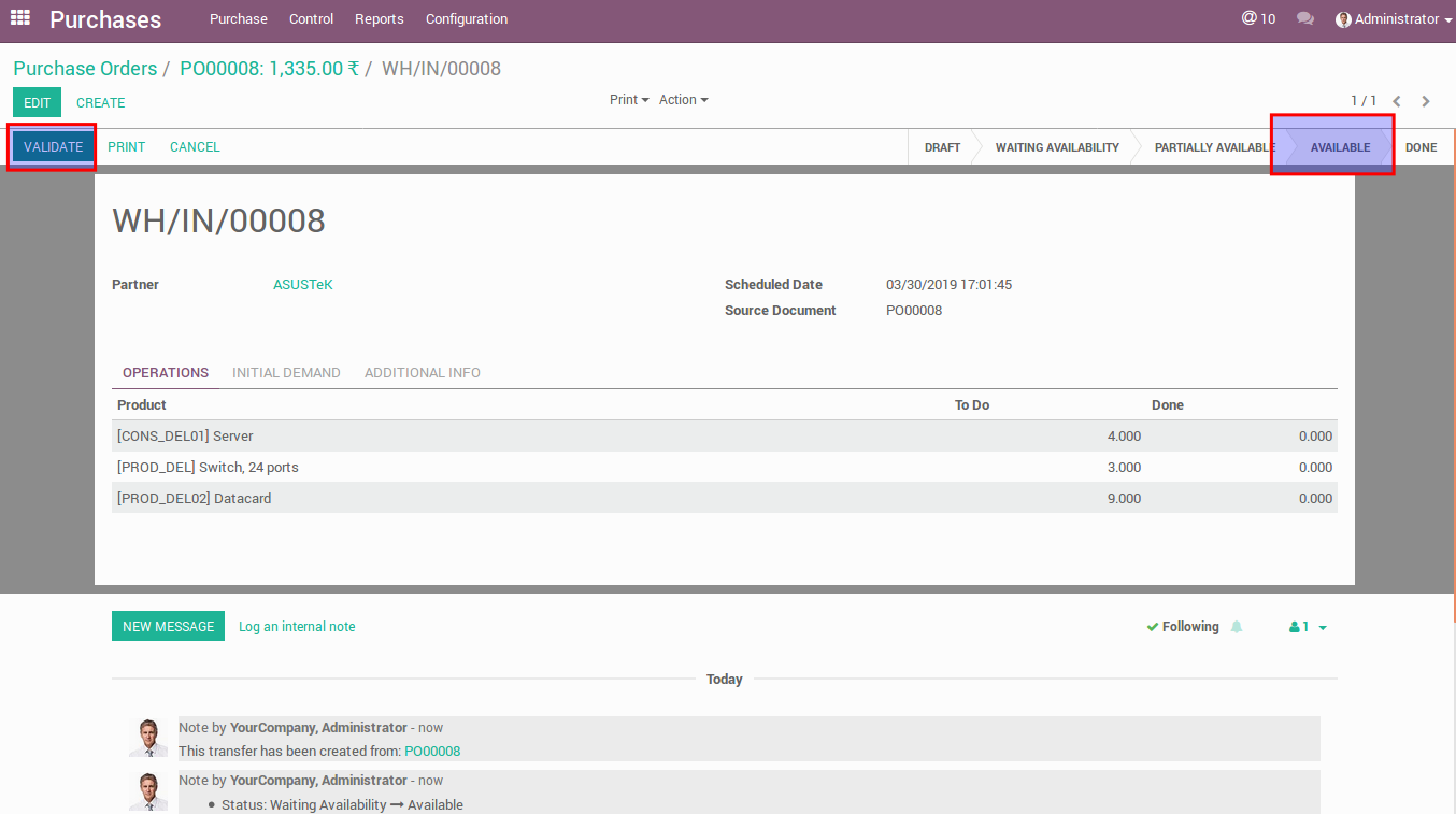 Below image is a incoming shipment on available state and then create Vendor Bill when validate it.