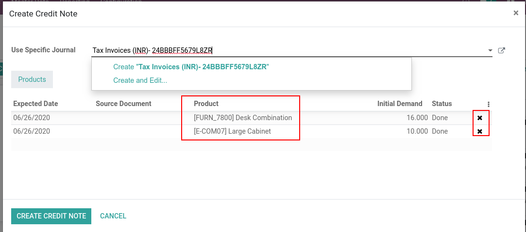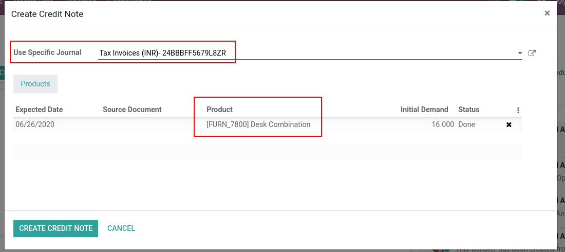 When user click on credit note they will select which product they need in credit note. And they can select journal from that popup.