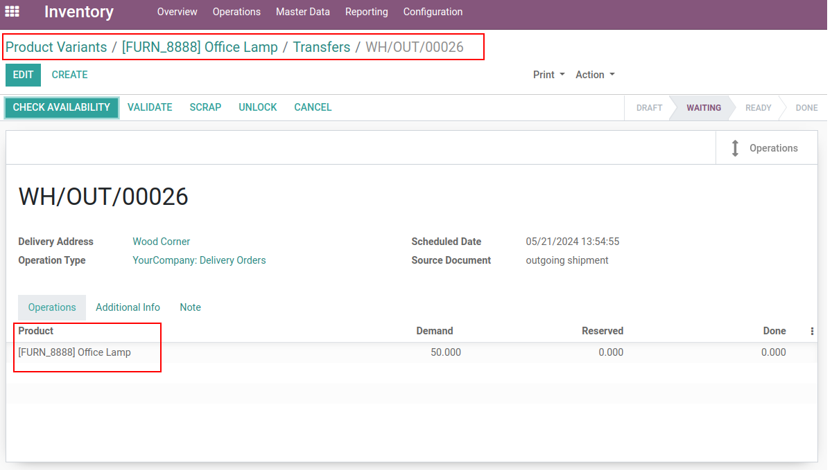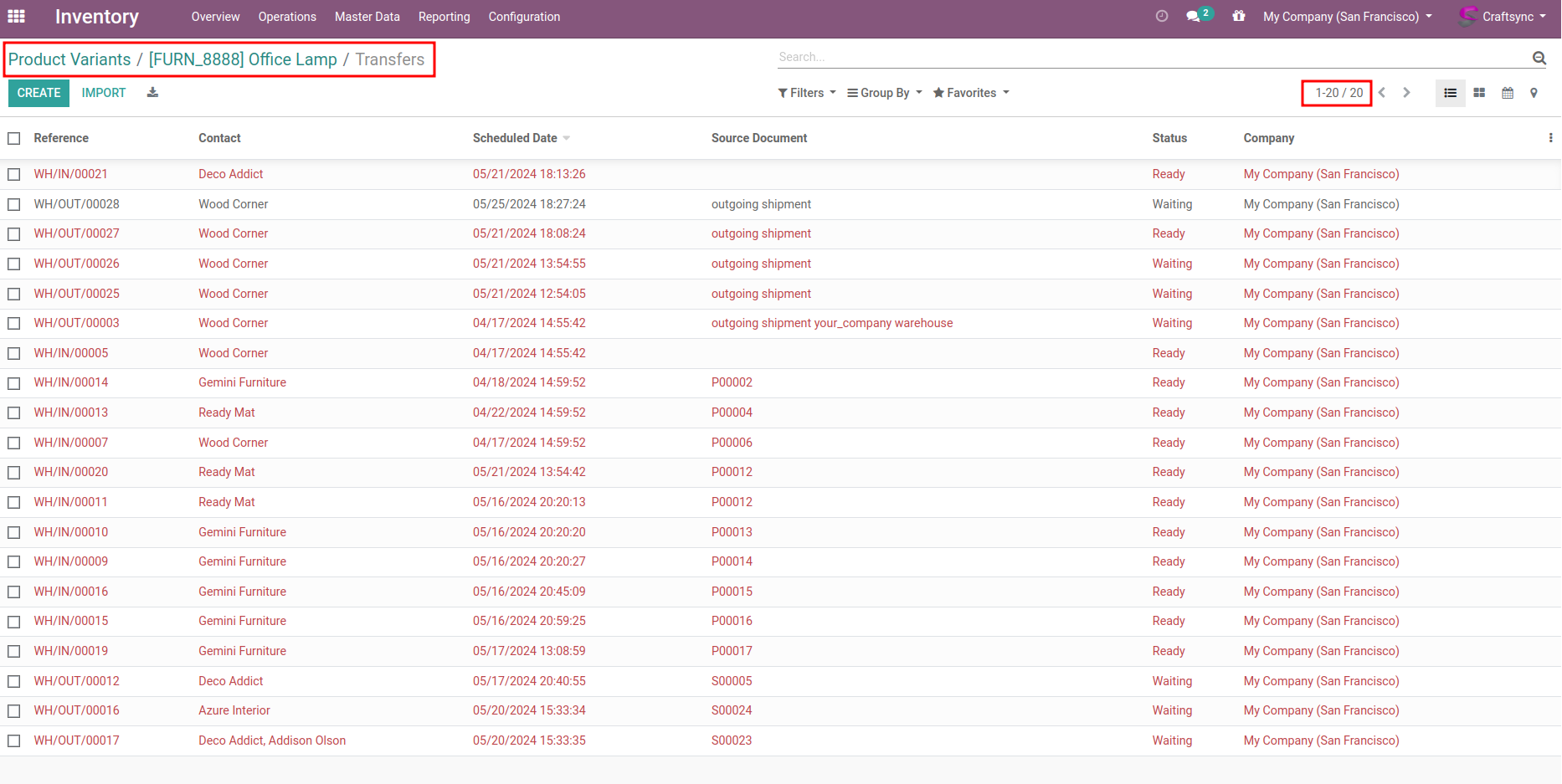 Here are Delivery orders whoes having office lamp as a product, DO list view having 20 pickings.