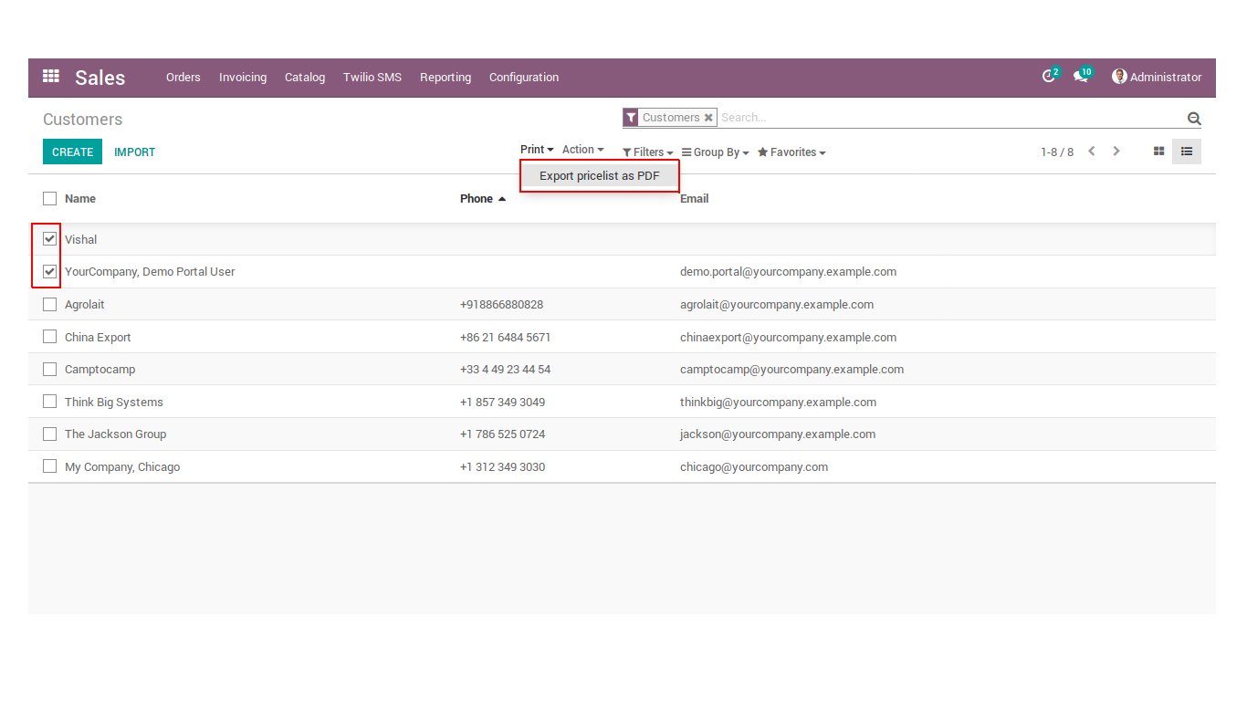- Select the customers >> click on Print >> Click "Export pricelist as Customer".