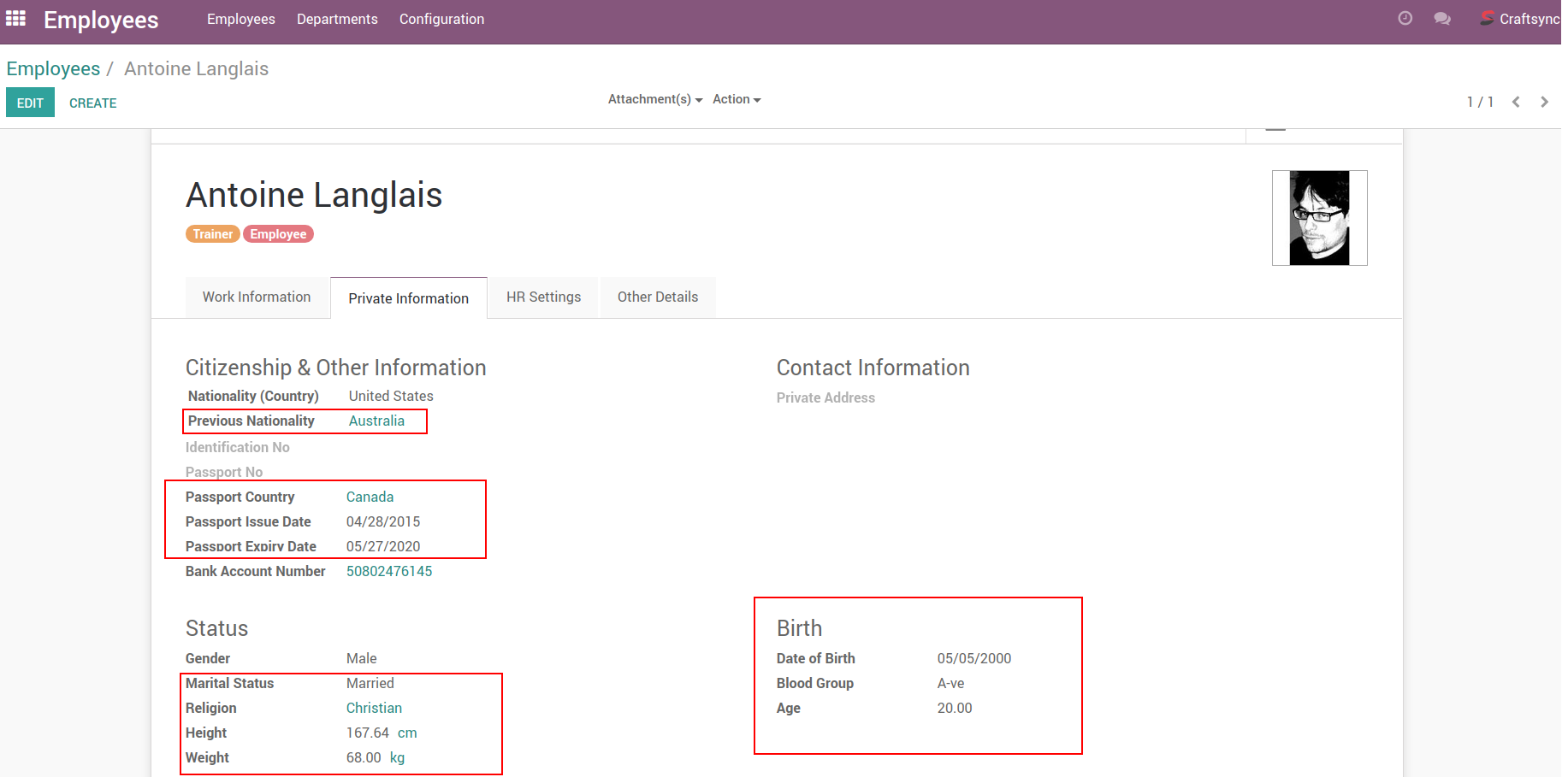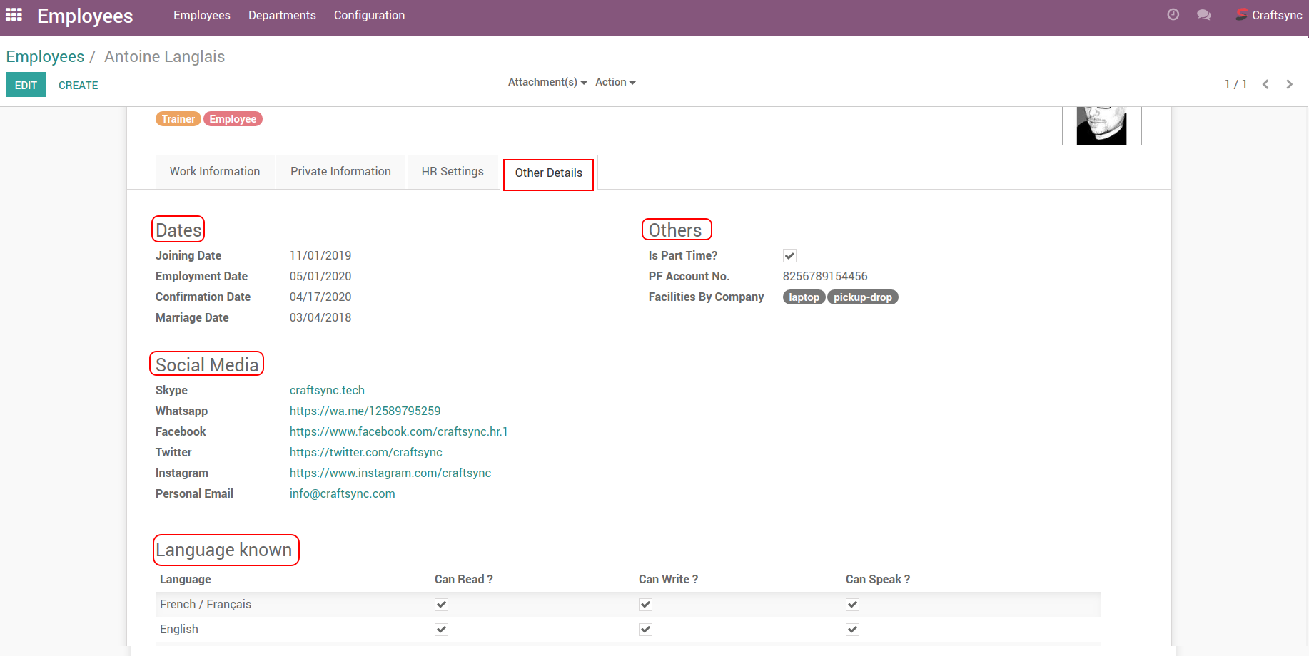 - Features: Track Employees social media & dates & languages & another personal details like height, weight, birthdate, marriage, passport.