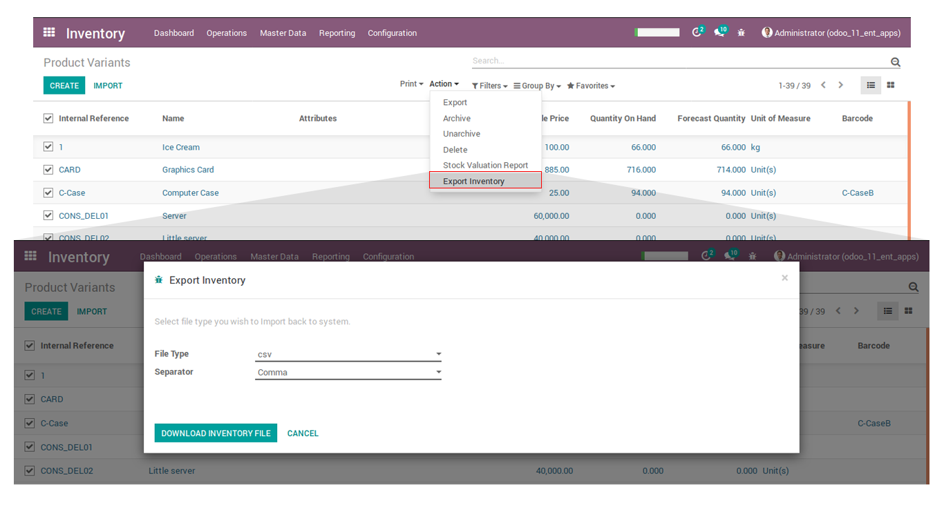 - Supported with less data like you can import inventory with only product name, barcode or Internal Reference (Default code) within same file.