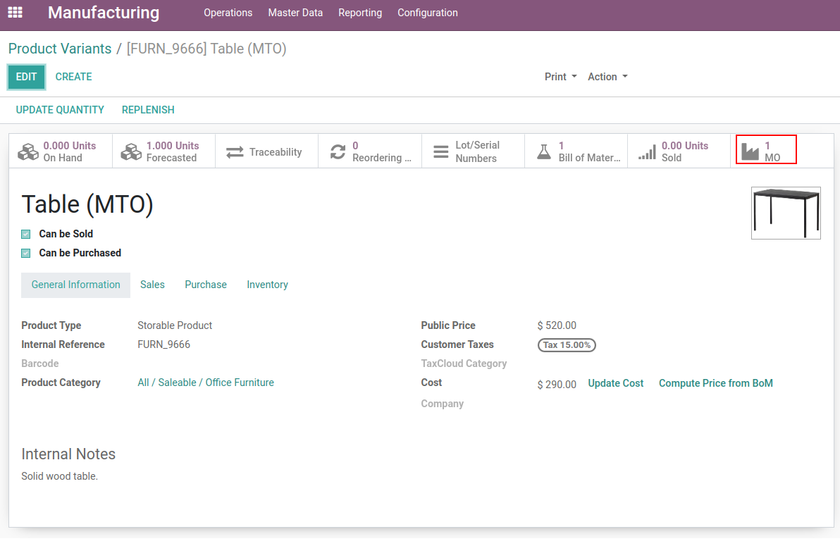 Here are MO whoes having Table(MTO) as a product, MO list view having 2 Manufacturing Orders.