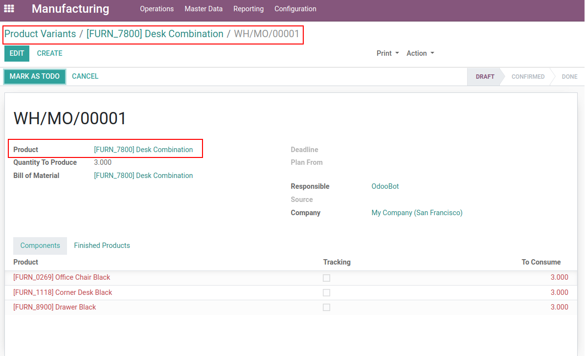 Detail view of Manufacturing order. After clicking mo smart button.