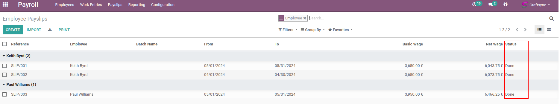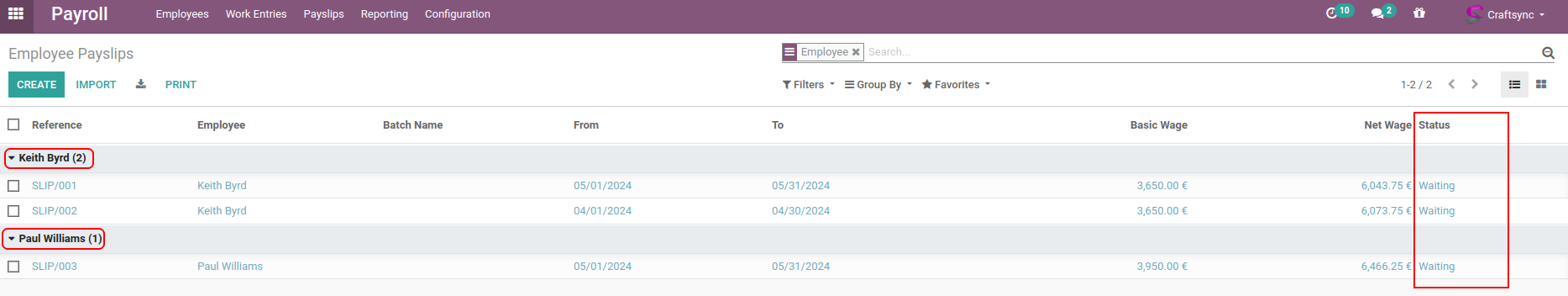 Here are Payslips whoes having Keith Byrd & Paul Williams as a Employees, Payslips list view having three Payslips are in Waiting state.