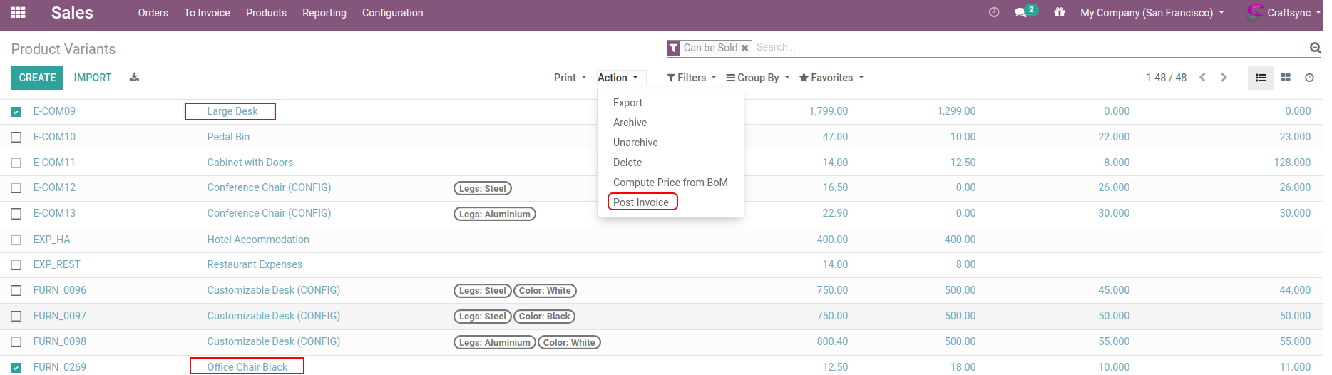Products list view having Post Invoice Action.