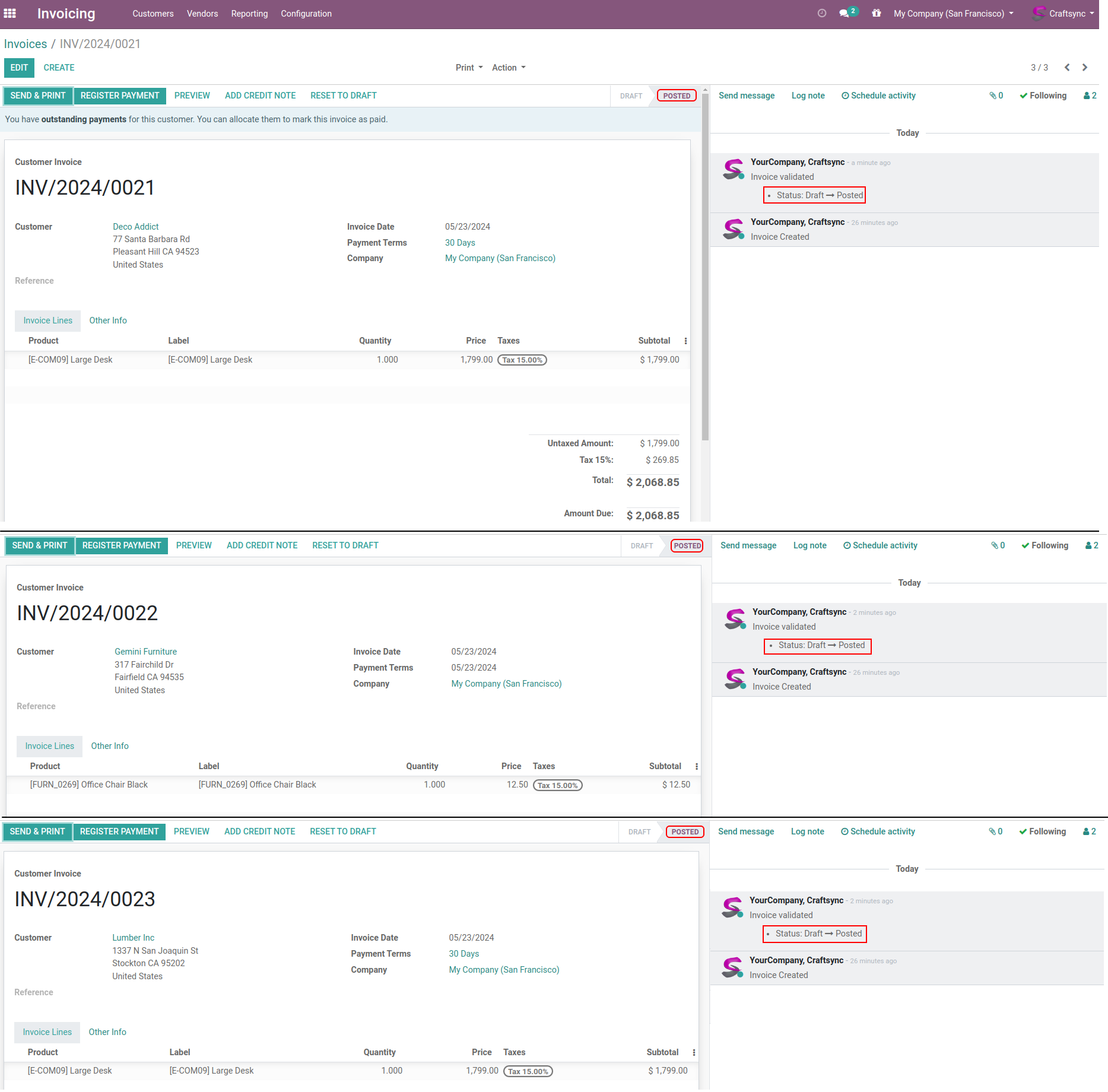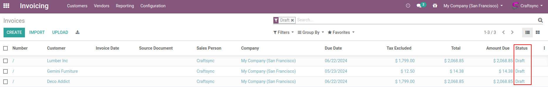 Here are invoices list view, whose having large desk and office chair as product. Invoice are in draft state.