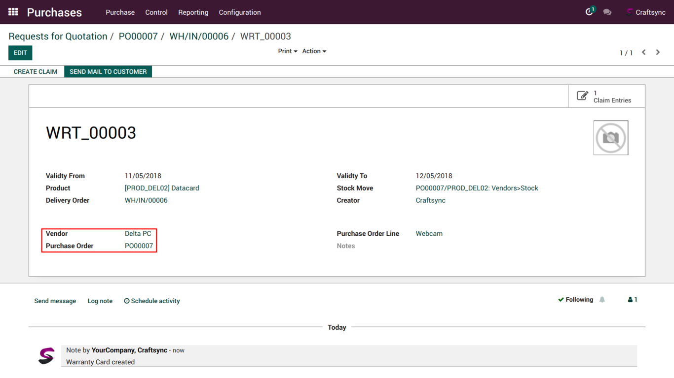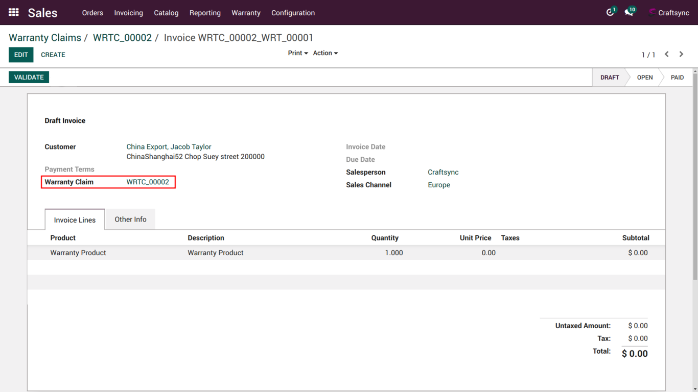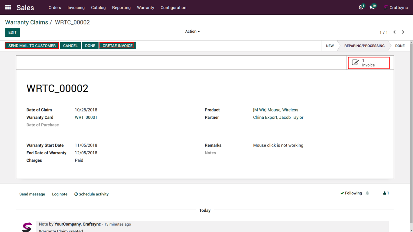 This is Draft invoice Image user can directly go to claim from invoice and reference is also set from warranty and claim's name.