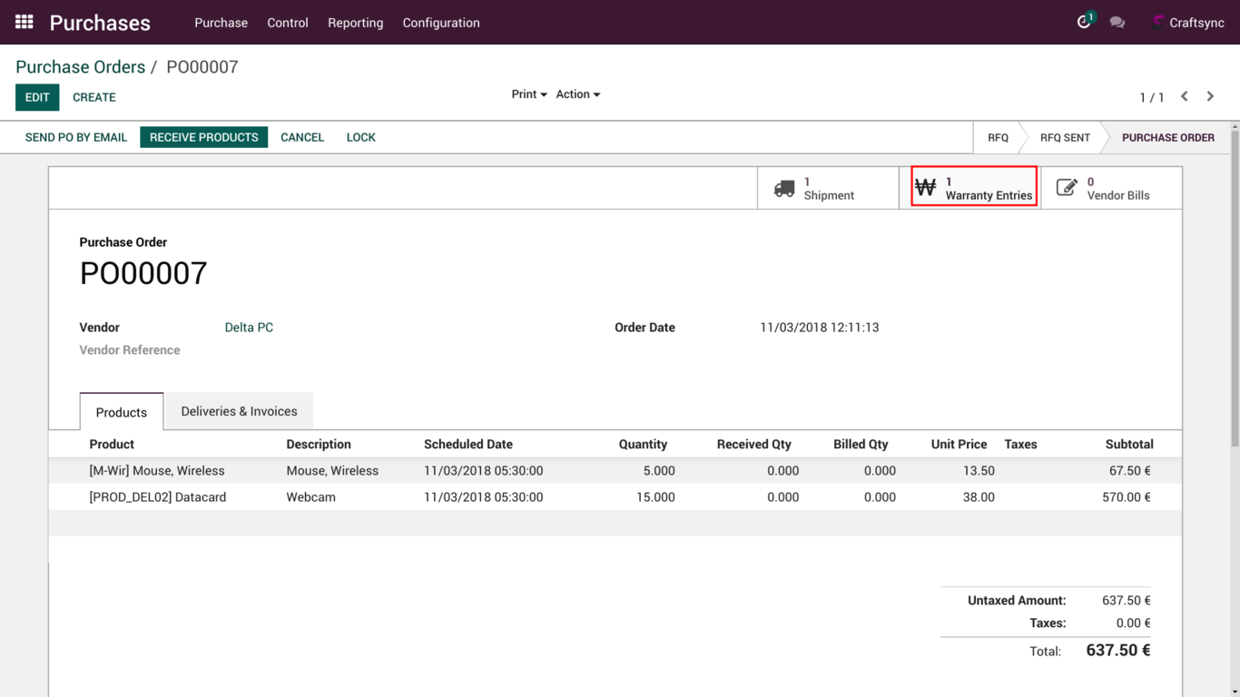 User can find Warranty entry from Purchase order.