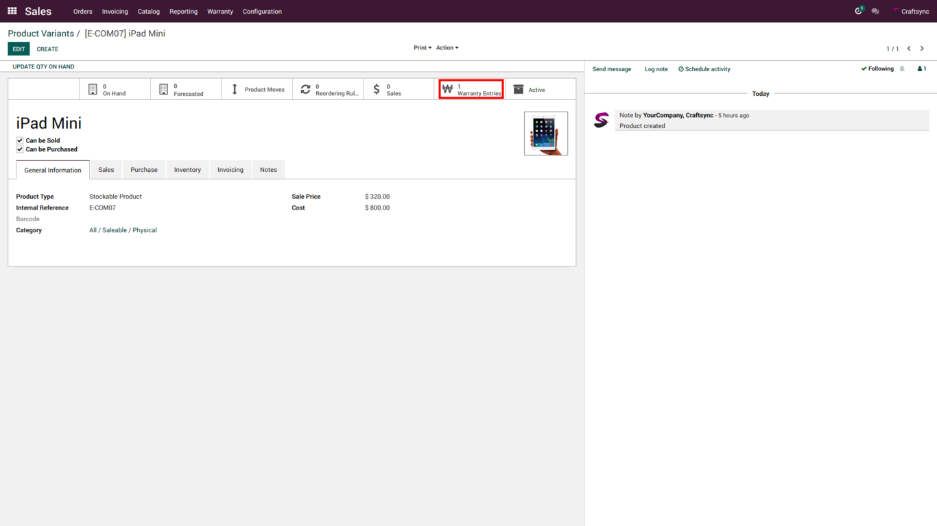 User can find Warranty entry from Product and Variant product as well.