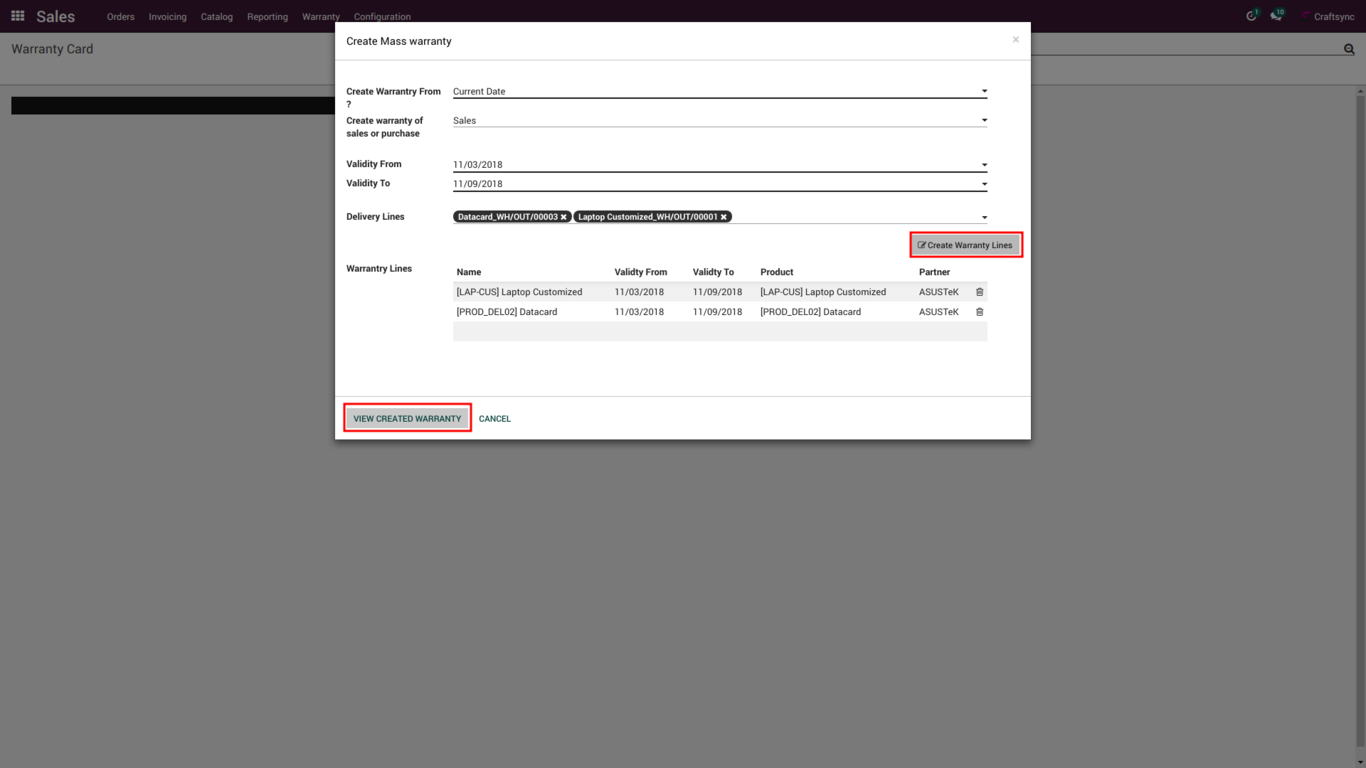 Above Image is shown when user will click create warranty button in delivery line.