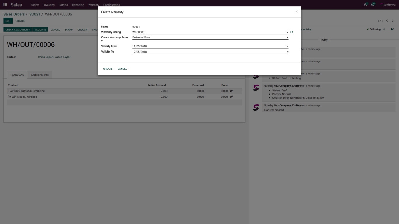 User will create warranty from delivery line and also create from all delivery line at one click.
