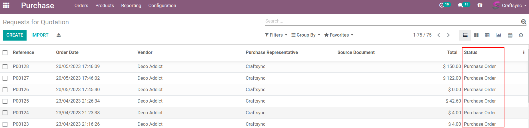 purchases orders list view after the scheduler run. Recently scheduler process this purchase order. And stage of this order was move to purchase order state from draft.