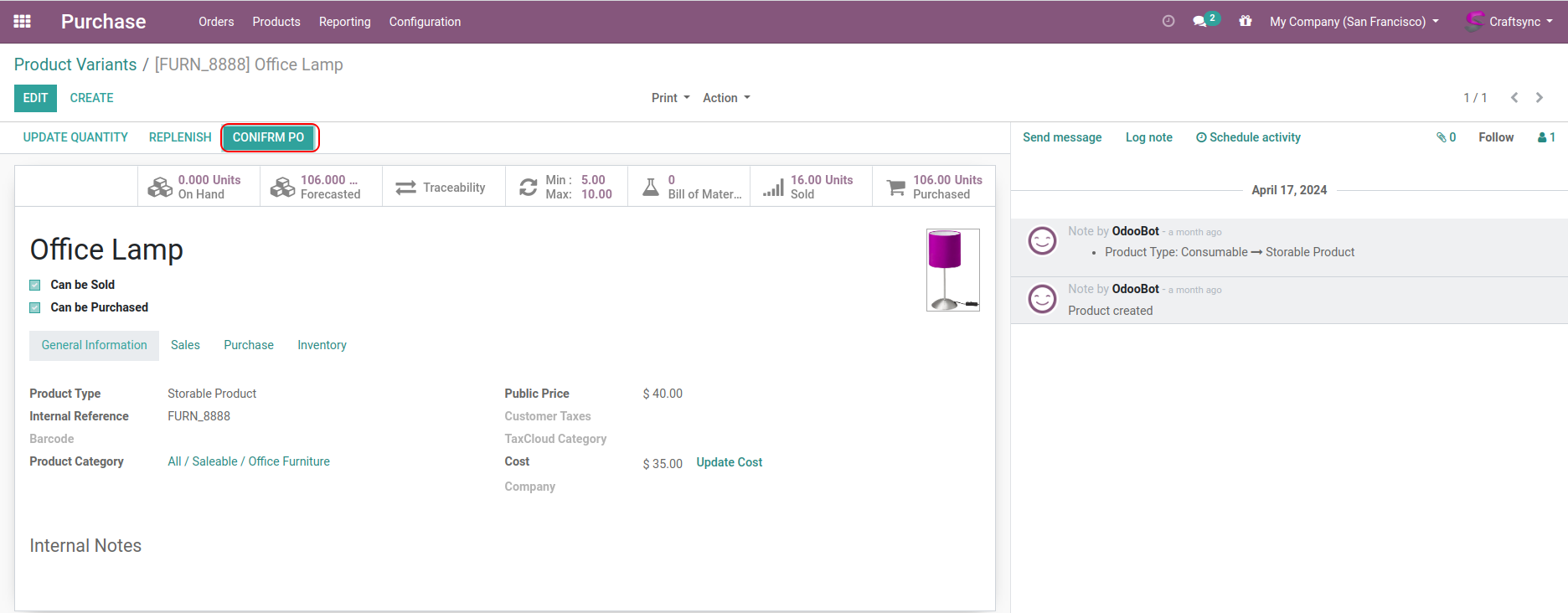 Detail view of Purchase order. After clicking confirm po button PO is now purchase order state.