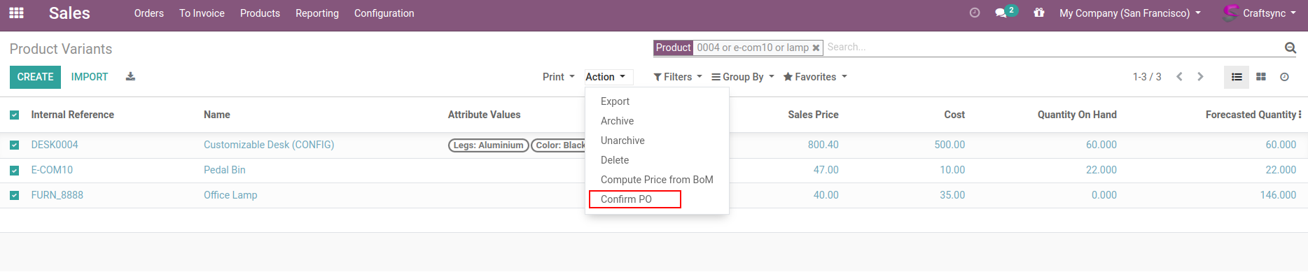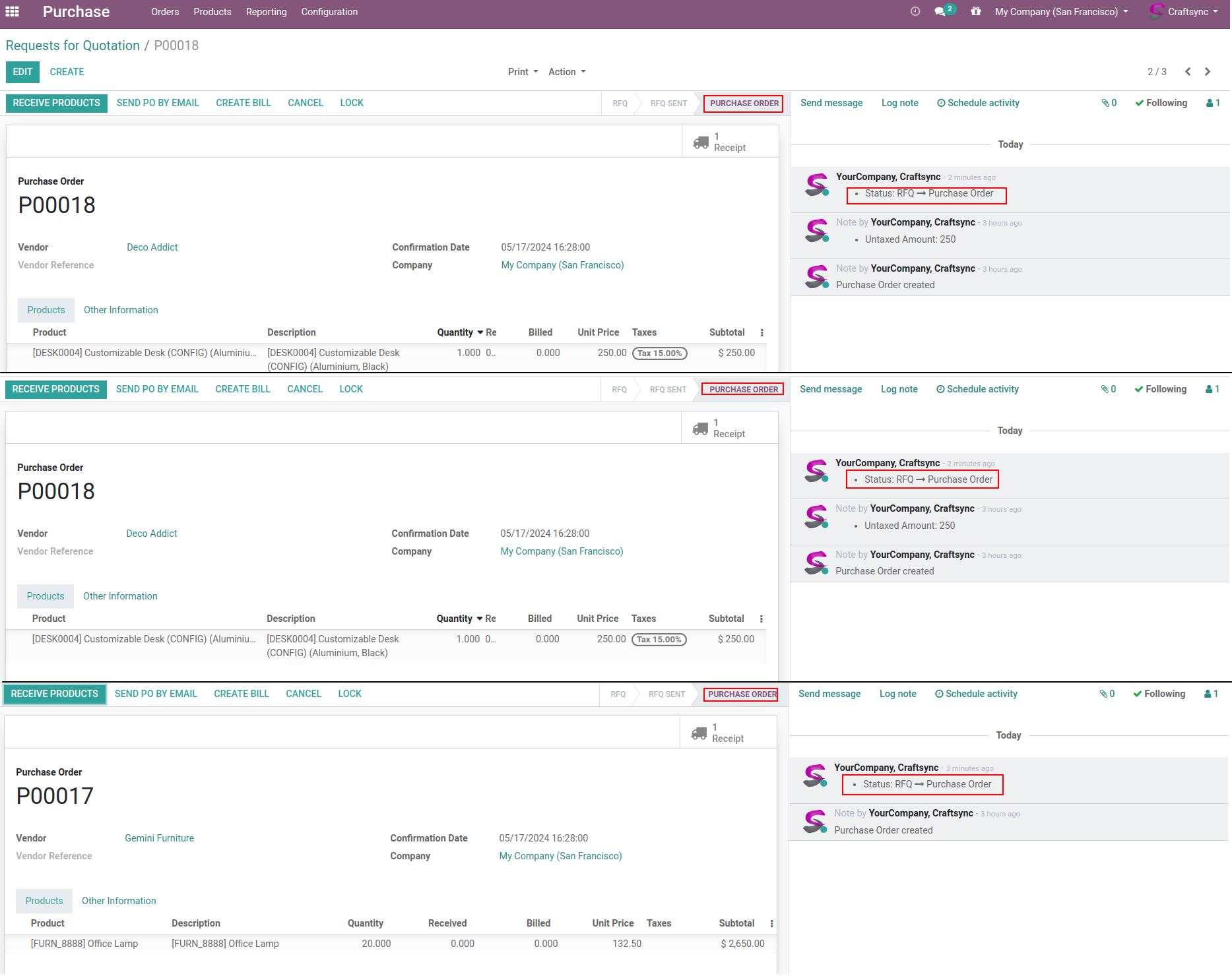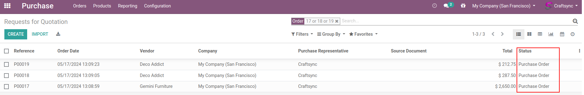 Here are Purchase orders list view, having three POs are in RFQ state.