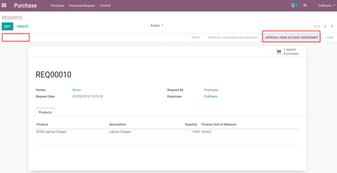 Above Image is of request by user or employee and stages that user have configured and vendor and product isn't require if user have not idea of that. And based on next stage configuration stage will change on approve button click.
