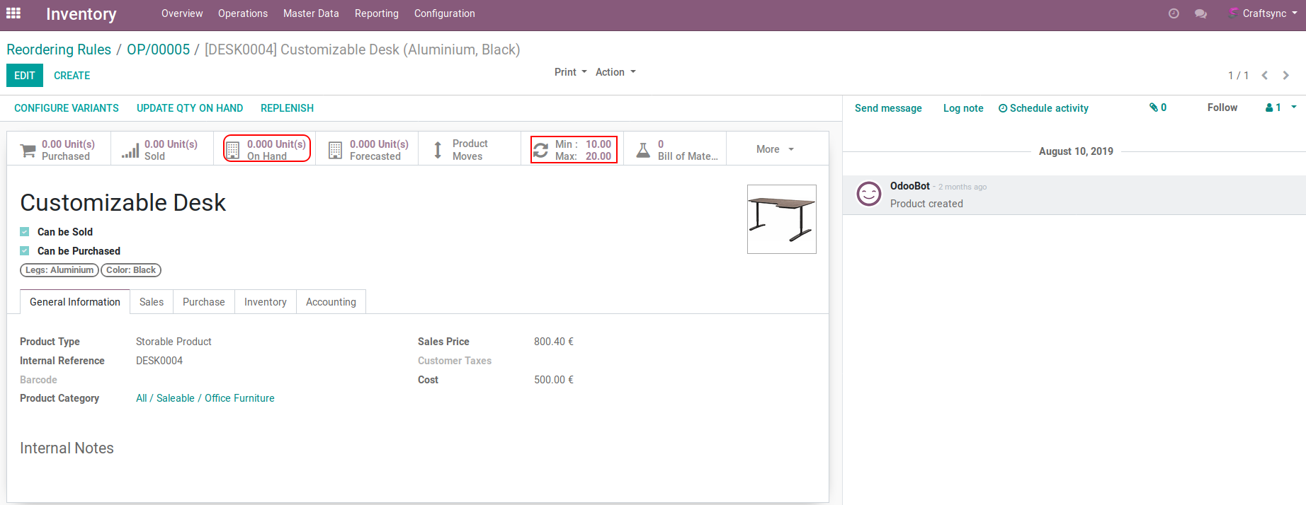 Customizable Desk has 0.000 Unit(s) On Hand Stock .