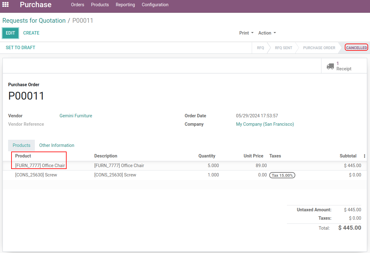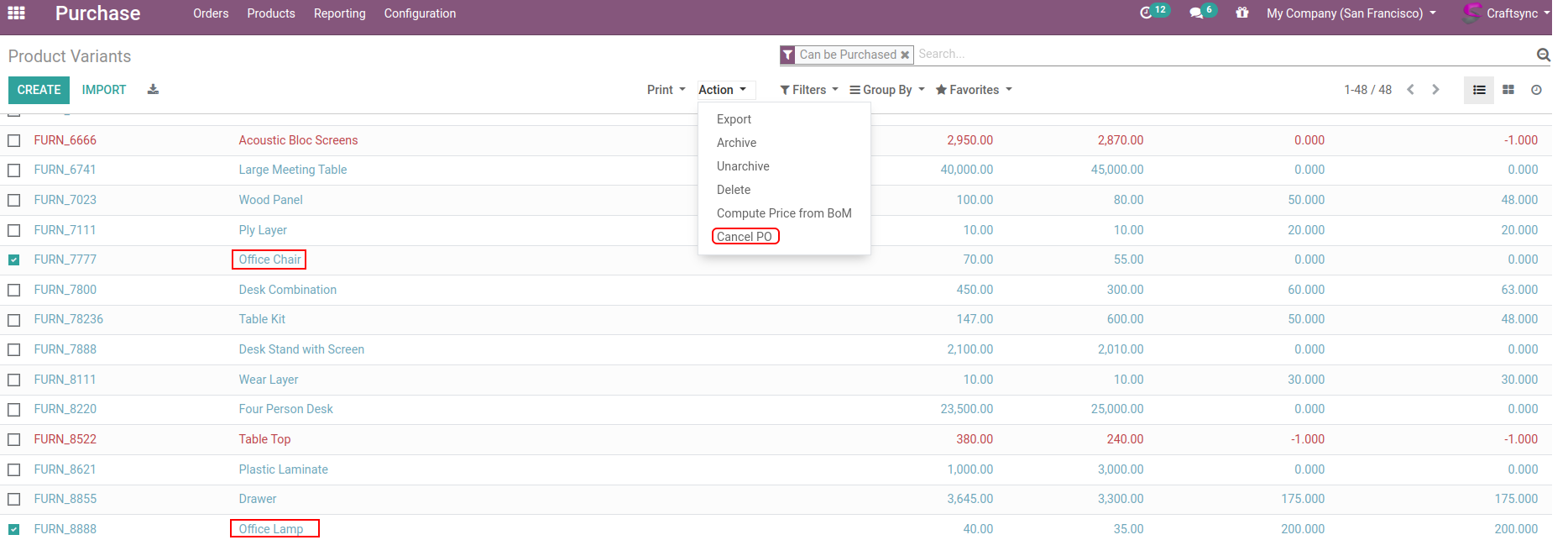 Here are Purchase orders list view, whose having Office Lamp and Office Chair as product. PO are in Purchases order state.