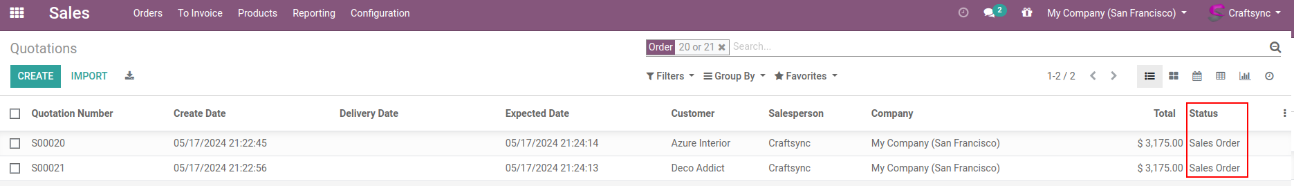 Here are Sale orders list view, having Two SO are in Quotation state.