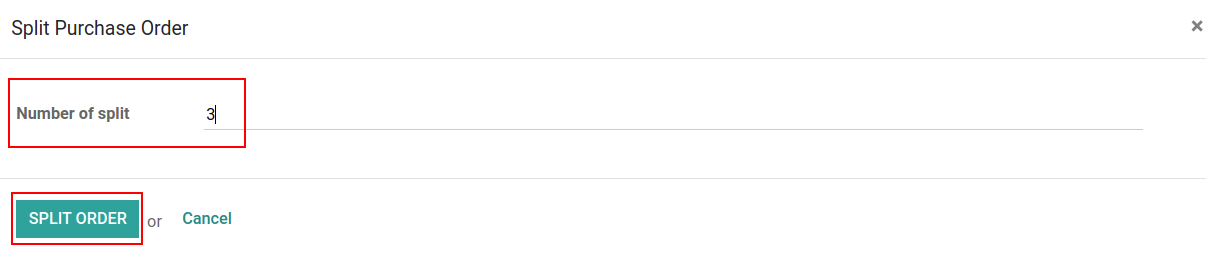 When user click on split Purchase order this popup(wizard) will open to enter split PO in how many parts?